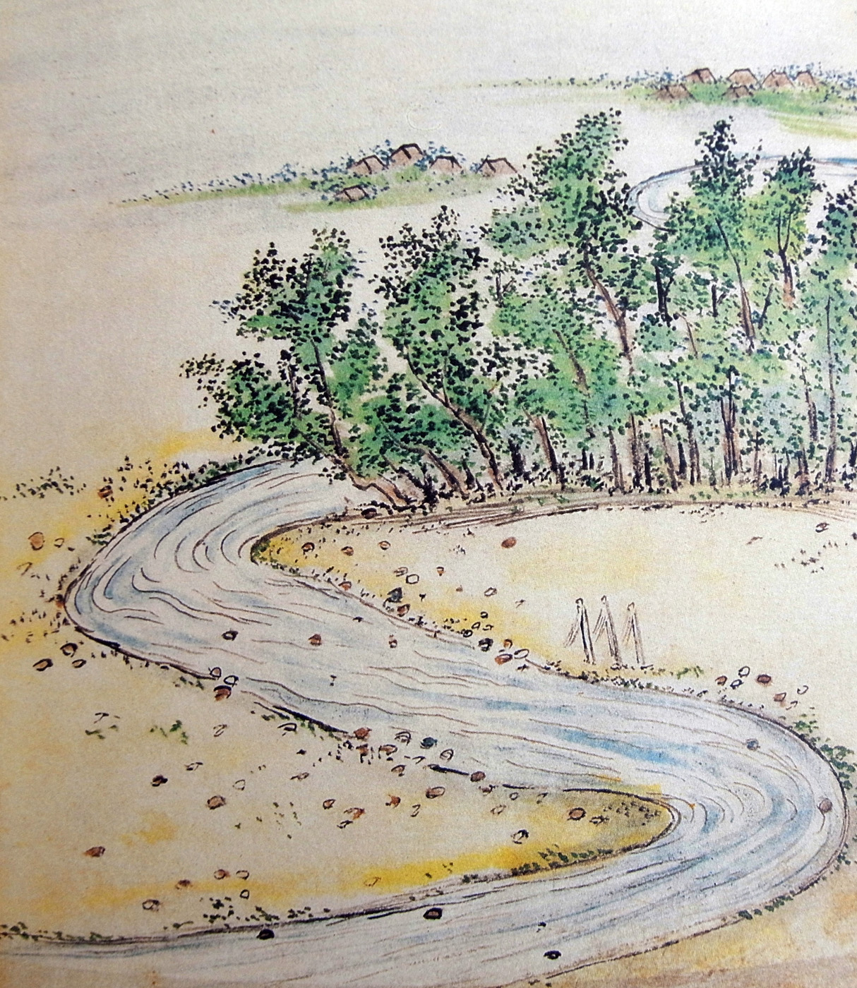 尚行ほどに小川のへたの白沙の上に、三束のヰナヲさしたり。