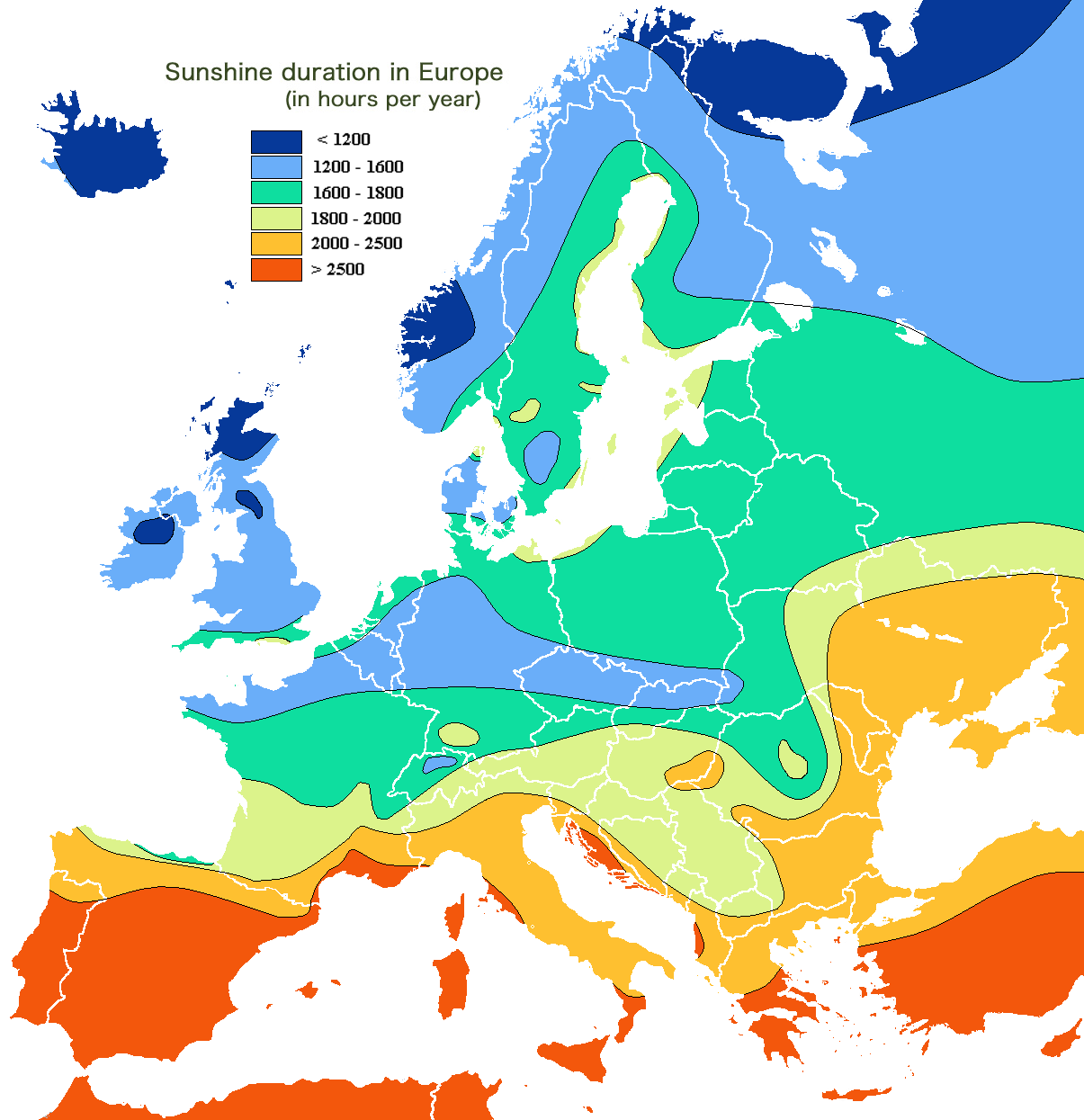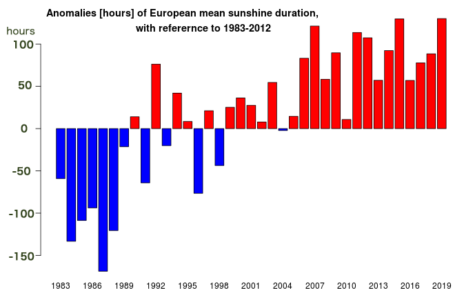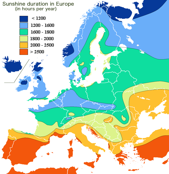 1年の可照時間は,12 × 365 = 4380 時間。 これに対する 2500時間の比は,0.57。 「産業」で大地を裸地にしてきた地域にこの日照率だと,後はサバク化に一直線である。 上のグラフ・図が示すヨーロッパでの日照時間の増加は,ヨーロッパのサバク化を表している。 そこで,日本の場合をこれと比較したくなるだろう。 気象庁の統計にあるのは,日本各地の「各年の月別日照時間」「各年各月の日別日照時間」である。 年間日照時間の推移を知りたければ,このデータをもとにして自分で計算することになる。 |