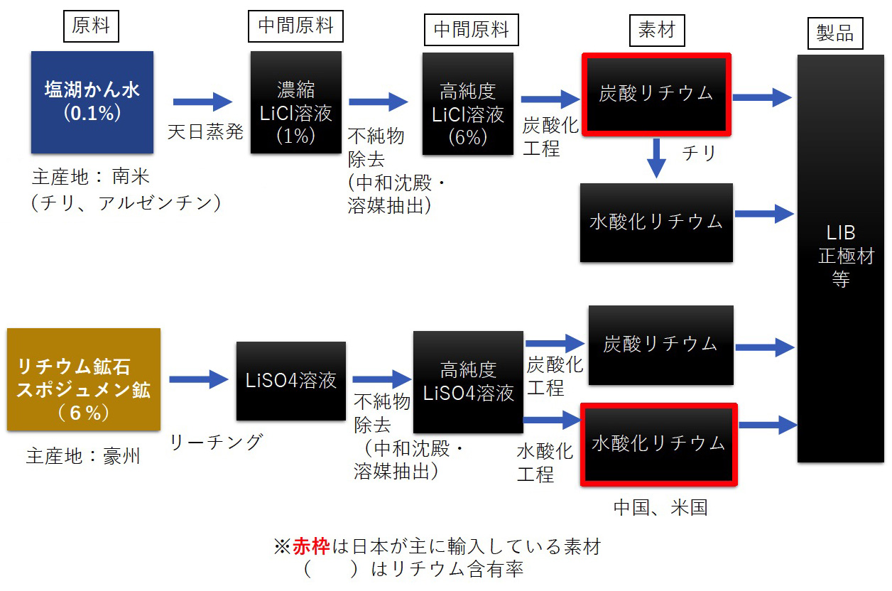 原料として、炭酸リチウムはLIBのニッケル系以外(コバルト系、マンガン系、三元系等)の正極材と電解質に使われ、水酸化リチウムはニッケル系、三元系正極材に使われており、それぞれの主要用途となっている。