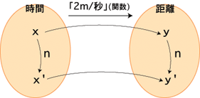 ここで,「集合」の考え (フィクション) を受け入れてください。──時間の集合 (すべての時間を要素とする集合) と距離の集合 (すべての距離を要素とする集合) 。