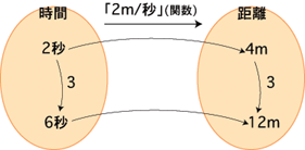 このとき,「2m/秒」における「時間が2倍,3倍,‥‥ になれば距離も2倍,3倍,‥‥」は,つぎのように言い換えられます: