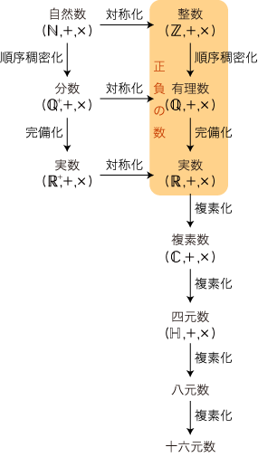 → 八元数 → 十六進数 どうしてこうなるかというと,新しい「数」をつくっていくやり方が,「直近の改造」だからである。 隣り同士は似ているが,隔たるにしたがい別物になっていく。