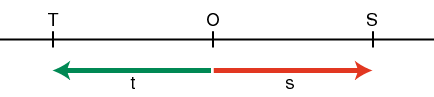 また,二つの位置(変位)P, R の対称性は,「原点(基準)Oに関してSとTは対称」という形でとらえるわけですが,これの意味は,OからSへの移動 s とOからTへの移動 t が互いに対称ということです。