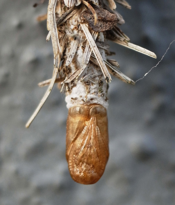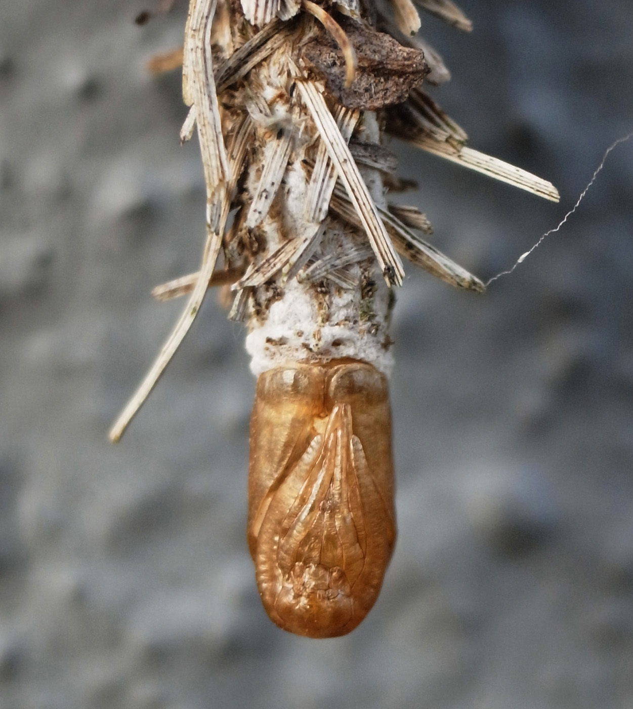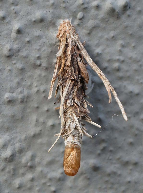 ♂では,蛹になってから約1カ月後、蓑の下の口から体を半分ほど外に出して,羽化する。