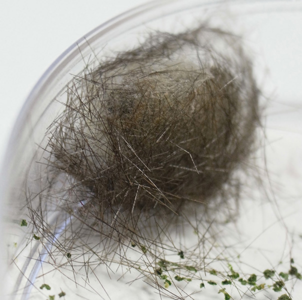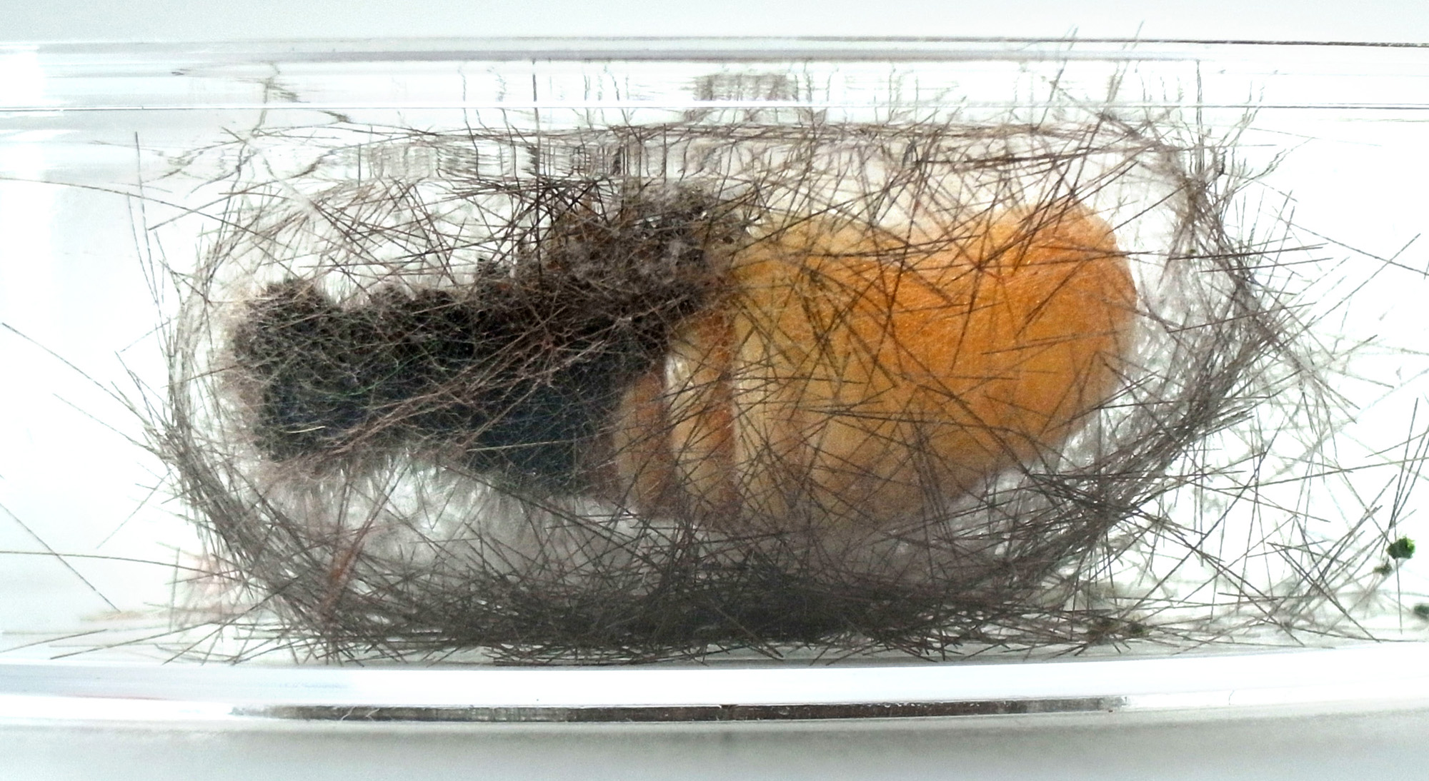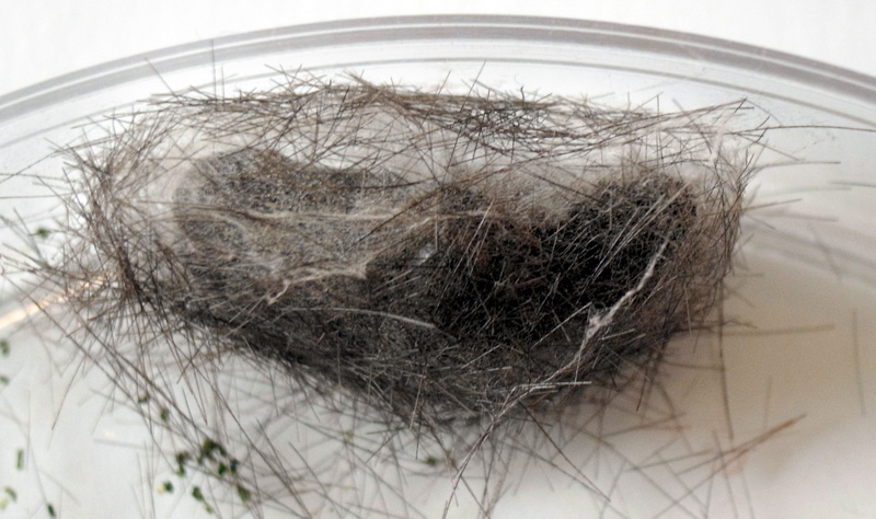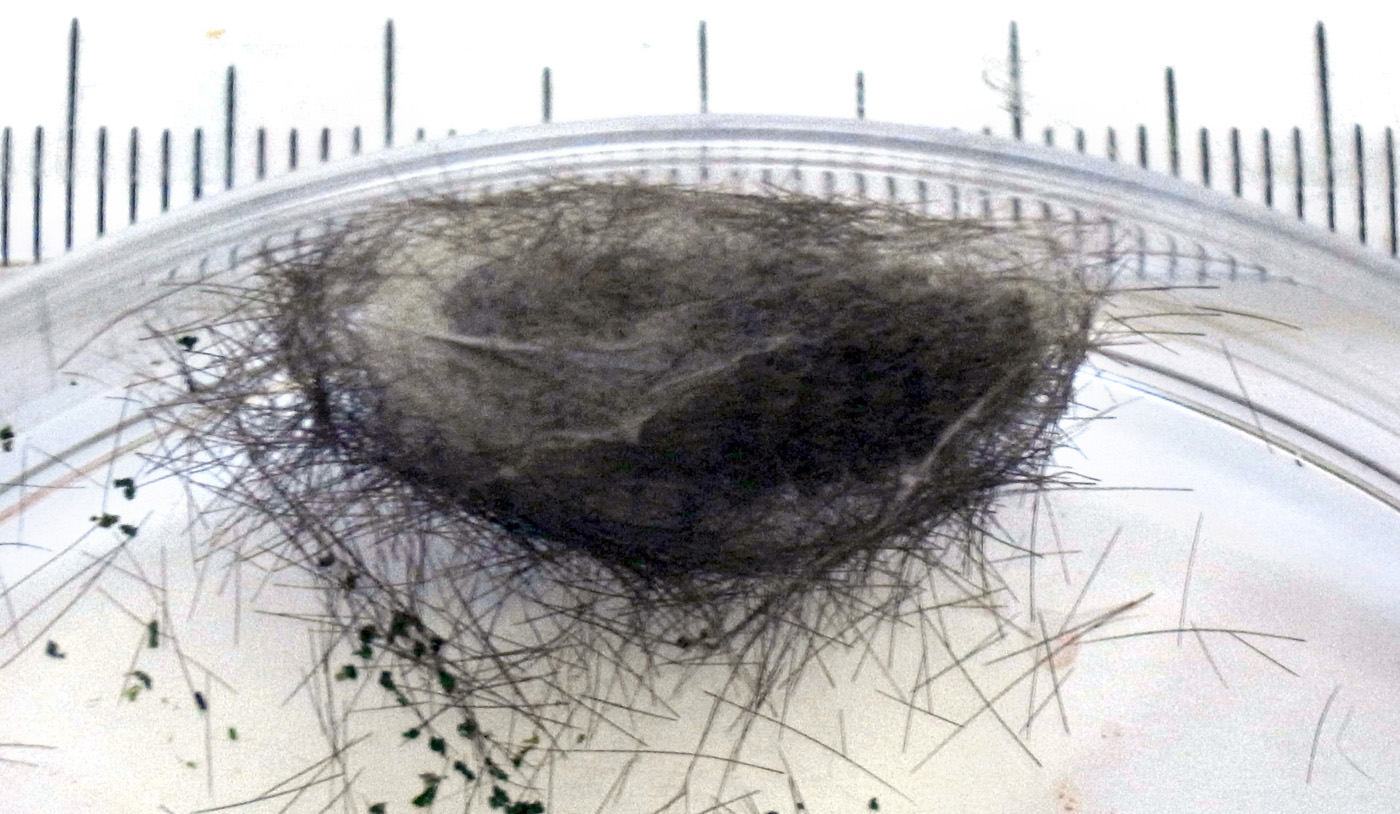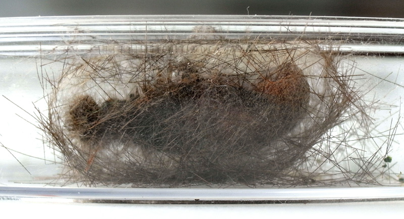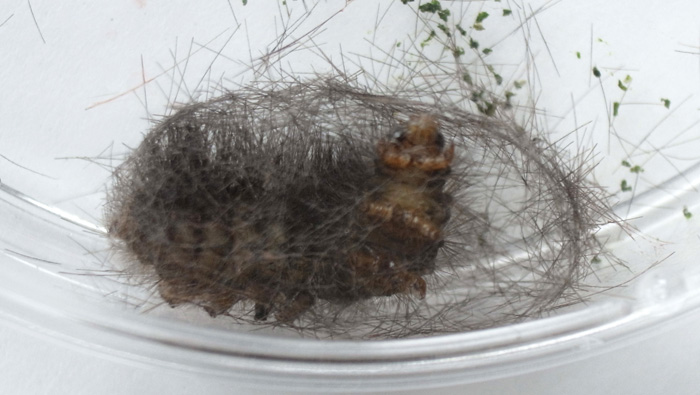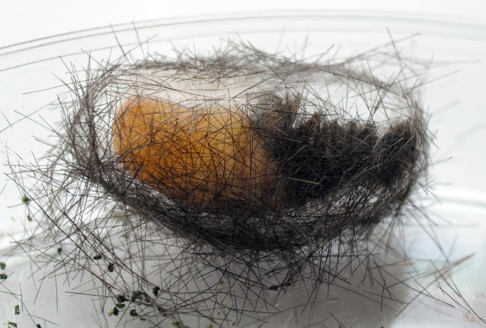 繭づくりでは,餌の葉も繭の材料にするらしい。 この度は,草の無いシャーレの中での繭づくりになる。 だいじょうぶか? 以下,繭の材料にする落毛の量も増えていく。 噛み切っているのか,抜いているのか,落とせるのか,わからず。 |
