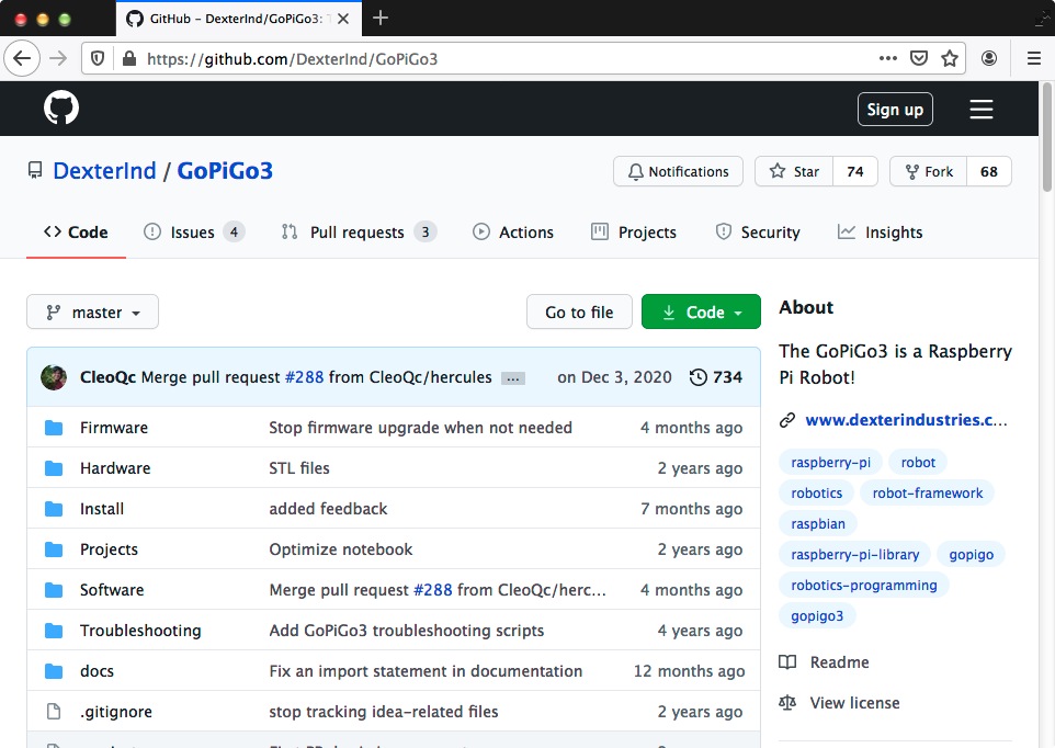 終了すると,pi のホームディレクトリに,ディレクトリ Dexter ができていて,この中にディレクトリ GoPiGo3 がある。