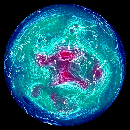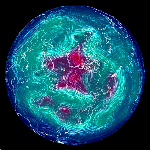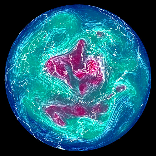左は北極を中心 (下方に日本),右は東京を中心 (上方に北極)