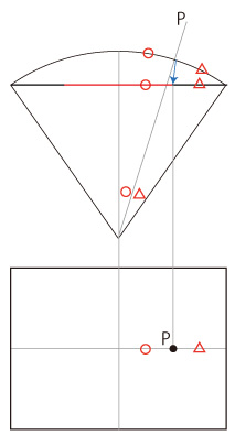 等距離射影のカメラだと,同じ大きさの正方形が並ぶことになる。