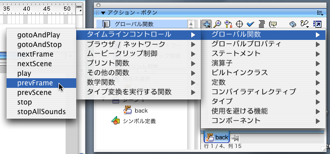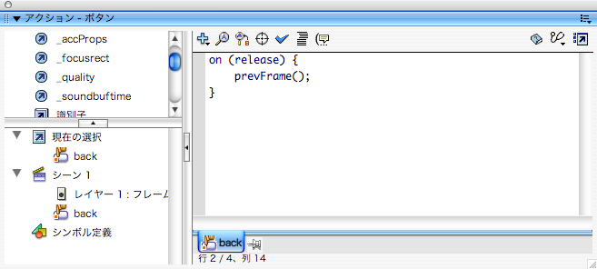 これで,「マウスのクリックで前のフレームに移動」のアクションが定義された。